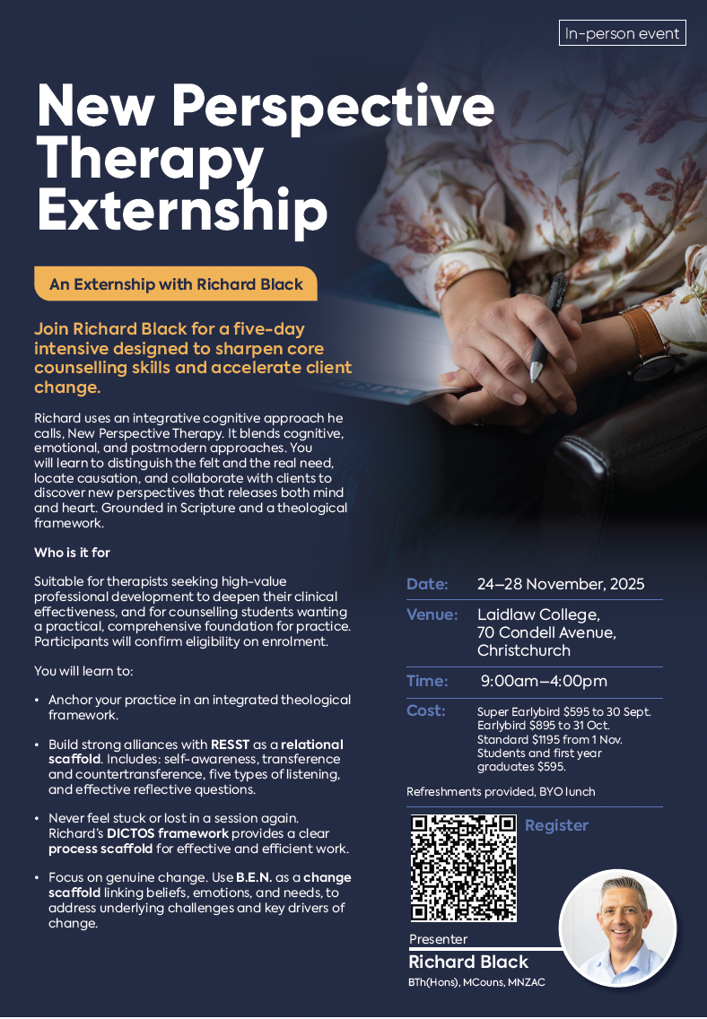 In this half-day seminar, counsellor and author Richard Black will help you understand how your mind works and give you a powerful tool to clear mental clutter, build emotional resilience, and respond more constructively in life’s pressures. You’ll learn how to spot unhelpful thought patterns, shift perspective, and gain greater freedom and clarity.